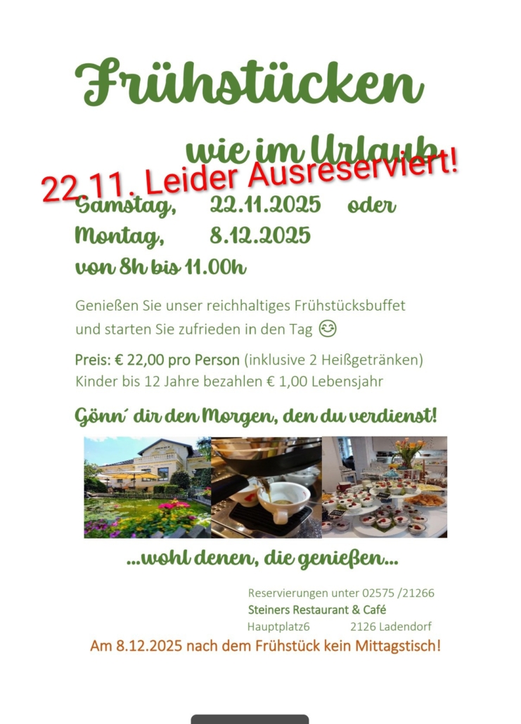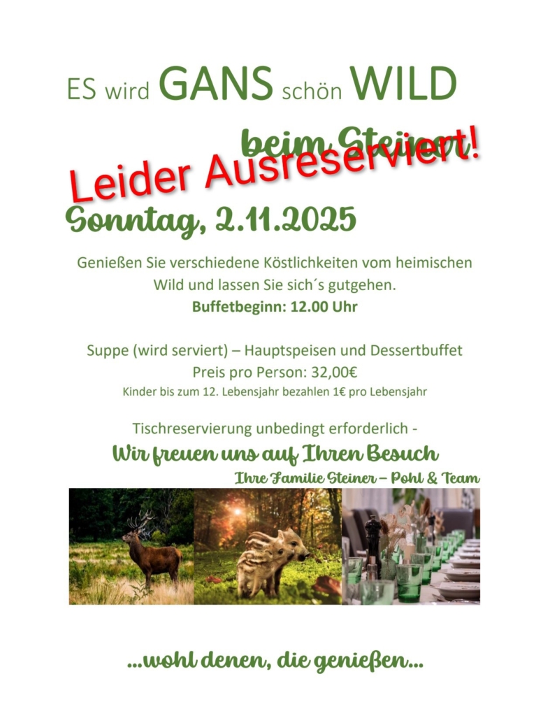 An dieser Stelle geben wir auch aktuelle Änderungen unserer Öffnungszeiten zB Hochzeiten, Feiern außer Haus etc. bekannt.